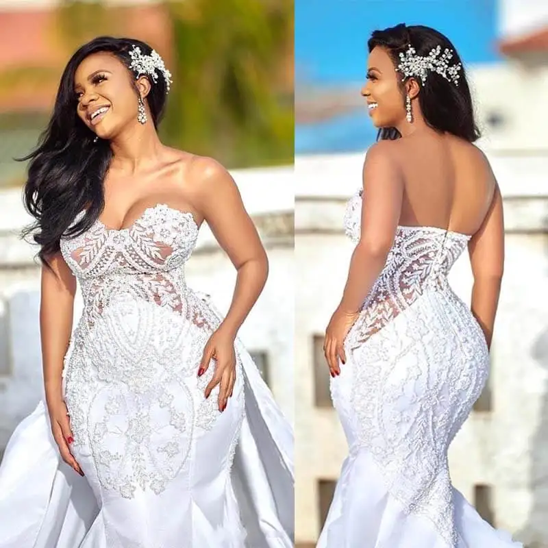 Good Price for 2020 African Plus Size Wedding Dress with Detachable Skirt Sweetheart Mermaid Wedding Gowns Appliqued Satin Bridal Dress