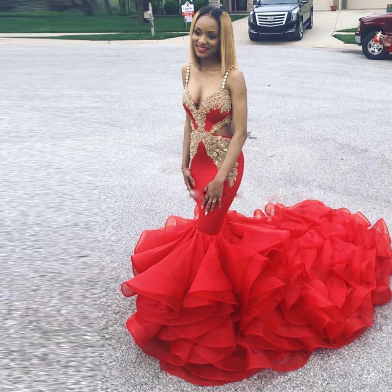 Buy Fashion Red Spaghetti Strap Mermaid Prom Dresses with Gold Appliques Beading Ruffles Tiered Bottom Evening Party Gowns 2019 and You will Save USD 0 or 0%, Because You Just Pay for 249.99 not Full Price for 249.99