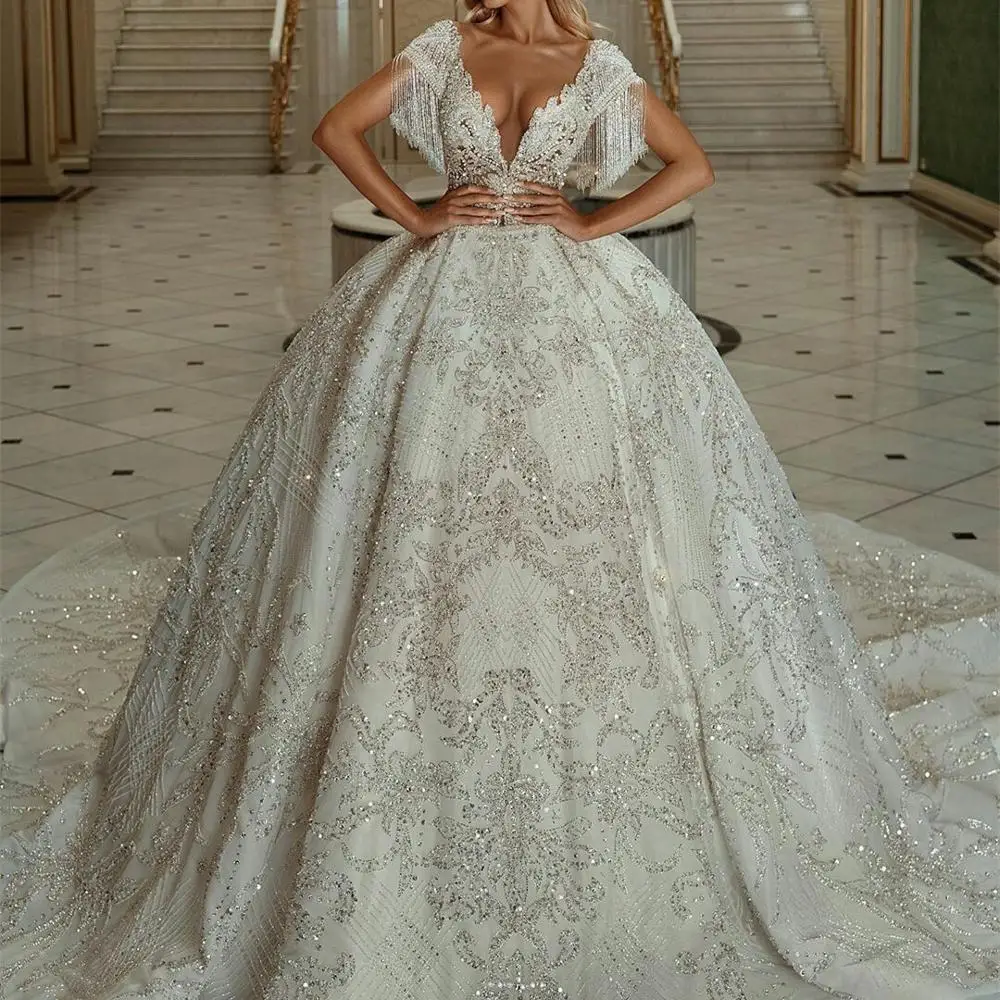 Luxury Ball Gown Wedding Dresses 2020 Sexy Deep V Neck Lace Sequins Bridal Gowns robe de mariée Plus Size Arabic Church Wedding
